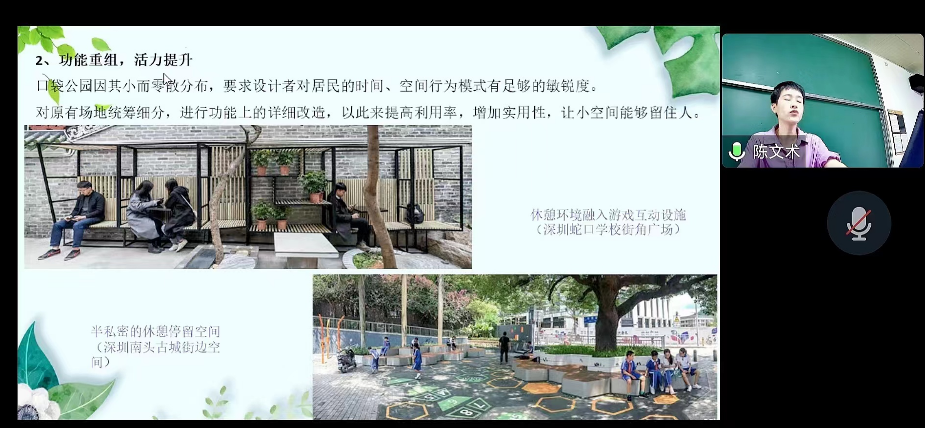 陈文术老师用通俗易懂的语言为大家讲述了口袋公园是什么,它产生的背景、类型、以及设计要点。城市的建设与改造让“微更新”成为主流,碎片化的更新带来了更多新方式,口袋公园让高楼云集的城市有了一丝绿意以及呼吸的空间。通过由点及面,联合贯通,以形成综合动态的网络体系,小面积上形成功能重组,从城市历史角度出发,学习结合海绵城市,将口袋公园作为联系生态,地域,文化三者的媒介形成一个完整的复合生态系统。