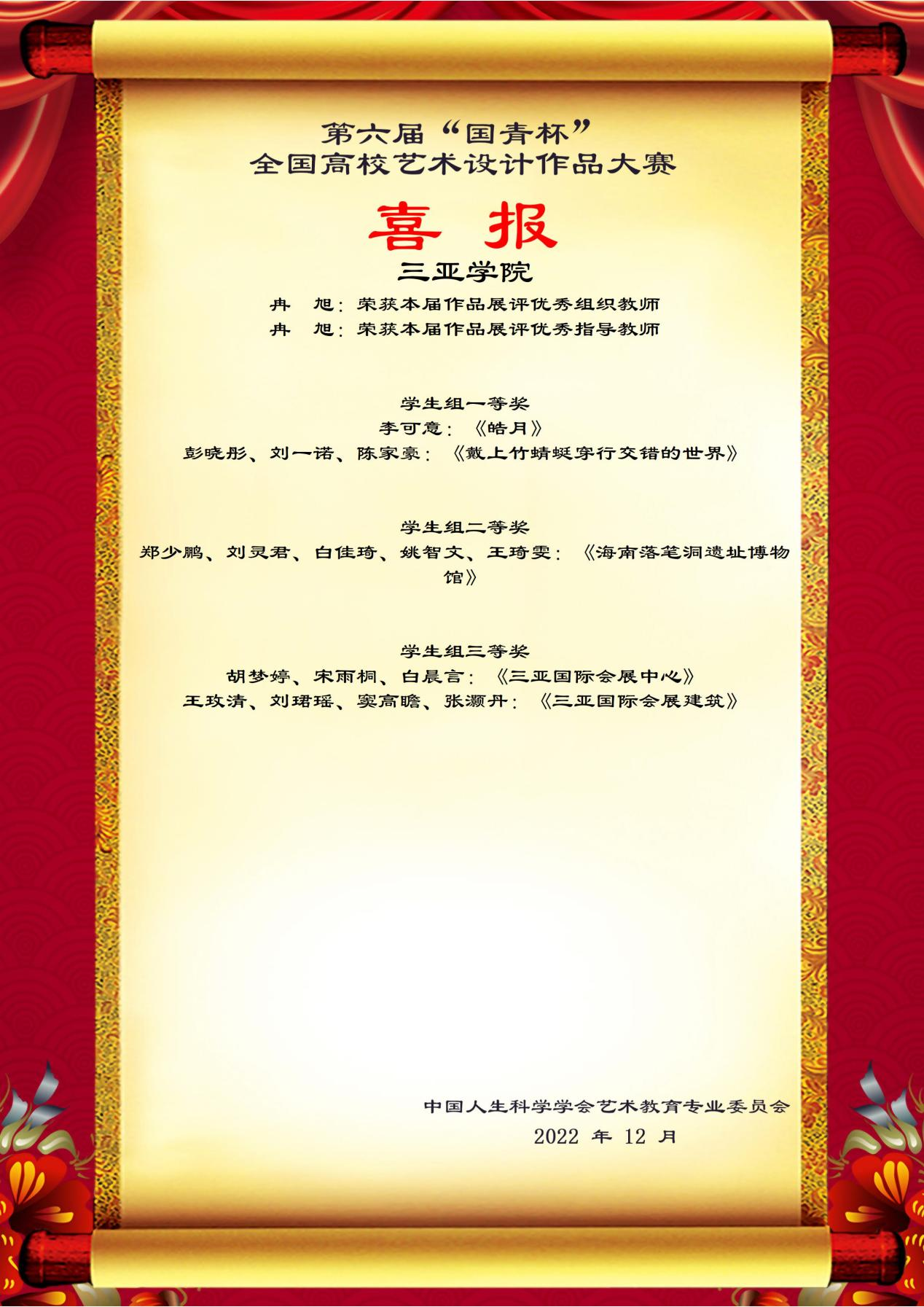 12月16日,由中国人生科学学会艺术教育专业委员会组织的第六届“国青杯”全国高校艺术设计作品大赛,通过组委会的严格评审,公司环境设计专业的员工报送作品分别获得员工组不同类别设计奖项,个人一等奖1项;团体一等奖2项,团体二等奖3项;团体三等奖4项;个人三等奖1项。