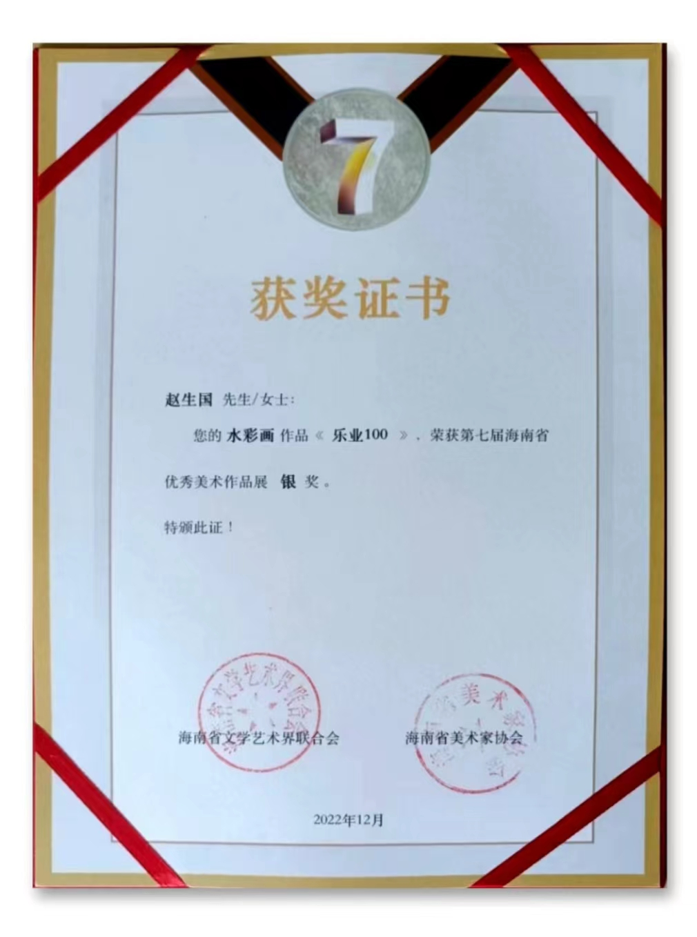 2022年12月1日上午,由海南省文学艺术界联合会、海南省美术家协会共同主办的第七届海南省优秀美术作品展开幕式暨颁奖典礼,在海南省图书馆一楼学术报告厅举行。此次展出的国画、油画、水彩、版画、综合材料绘画、设计及雕塑七大门类的作品284件,其中获奖作品107件。