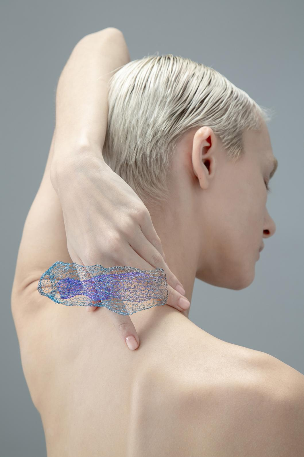 色彩特点:作品色彩搭配灵感来自于深海微型发光生物,但在色彩的应用上主要选择了蓝色和紫色,再加以小色块的对比色设计。整个作品神秘而空灵,在不同电流下形成的色彩自然而夺目,因钛金属丝材质的特殊,不同角度会变换不同的色彩。