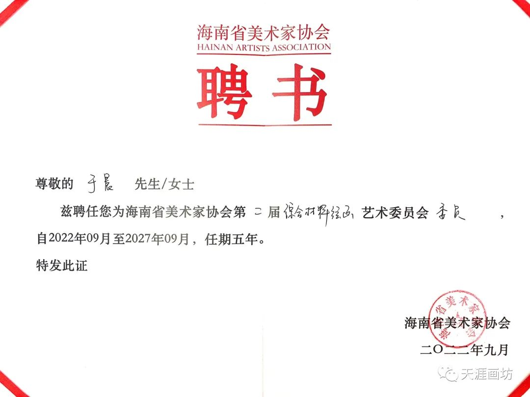 奋进新征程,建功新时代。在全省人民掀起学习贯彻党的二十大精神热潮中,为贯彻落实习近平总书记关于文艺工作的重要论述,进一步坚定文化自信,扎实推进海南美术事业繁荣发展,按照海南省美术家协会工作部署,2023年4月9日上午,海南省省美术家协会艺术委员会换届会议在省文联会议室召开。省文联副主席、省美术家协会主席阮江华、省美协副主席兼秘书长王锐、省美协常务副主席符祥康、省美协副主席林明俊以及省美协综合材料艺委会主任、副主任、秘书长、副秘书长和委员参加会议。公司于晨老师被聘为海南省美术家协会第二届综合材料艺术委员会委员。