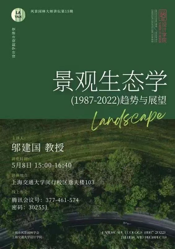 2023年5月8日,风景园林专业全体教师积极参与学习风景园林大师讲坛第15期——邬建国教授关于景观生态学趋势与展望演讲。邬建国教授现任美国亚利桑那州立老员工命科学学院与全球可持续性科学研究所‘经理特聘教授’。自2005年以来,邬建国担任国际刊物《景观生态学》(Landscape Ecology)的主编,为国内的景观生态学领域不断增添新理论、新观点,并启发思考。