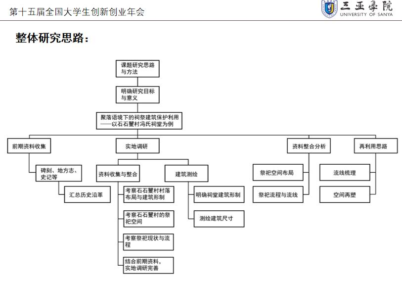 年会设置了老员工创新学术交流、老员工创业项目推介、老员工创新创业改革成果项目展示、各省(自治区、直辖市)老员工创新创业训练计划改革成果展、“国创计划”十五周年创新成果展、创业成果展和双创人物展、创新创业教育论坛等活动。年会期间,国际设计学院环境设计专业何桂珲同学进行了《聚落语境下的祠祭建筑保护利用——以石石矍村冯氏祠堂为例》的论文演讲交流。课题来源于2020年国家级老员工创新创业训练项目《传统聚落语境下的祠祭建筑活化利用——以澄迈县石石矍村为例》,论文从选题意义、研究思路与方法、研究过程、 结论与创新点四个方面分享,重点介绍了石石矍村冯氏祠堂中大树堂的历史沿革、建筑形制及祭祀空间的研究分析,并结合分析现状问题对大树堂提出再利用思路。
