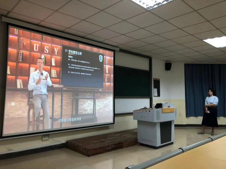 在见面会开始师生共同观看由陆丹博士和陈琳常务副经理带来的“开学第一课”。陆丹博士从开启大学之门学习的价值及目标等方面的内容进行详细的解读,并给予殷勤的期望。陈琳常务副经理则从学院组织框架、专业设置、教学内容以及教育特色等方面给予解读。