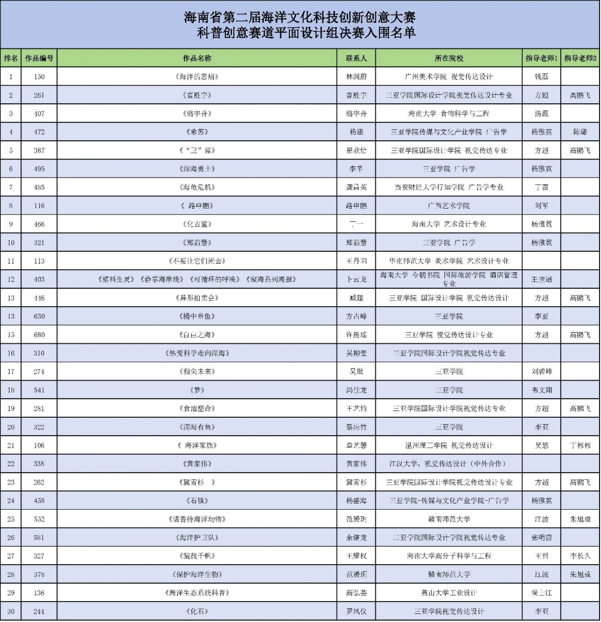 由海南省科学技术厅、海南大学主办的“海南省第二届海洋文化科技创新创意大赛”已于2023年9月25日完成初赛评审,3044am永利集团3044noc视觉传达设计专业师生共计十二组入围。现将入围名单公布如下: