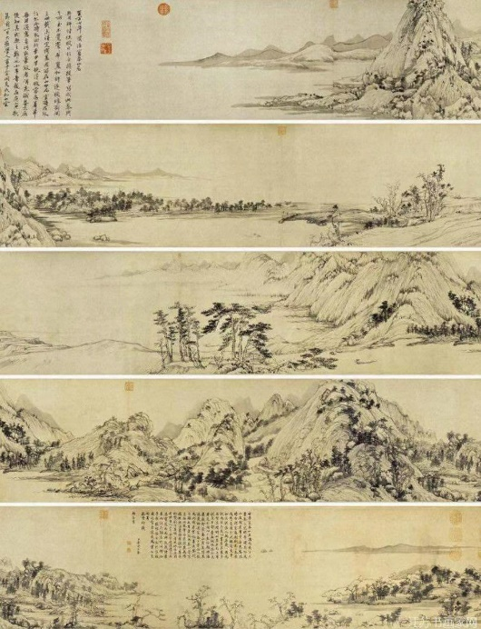 后半卷无用师卷篇幅较长,图中山峦形态活泼多变,树木姿态各异,山石的勾、皴,用笔顿挫转折,随意宛然天成。作画者由近及远的绘画手法使画面有着非常清晰的层析,前后景物有效联系,显现出了画面的阔大之意,给观者留下更为广阔的思考空间。