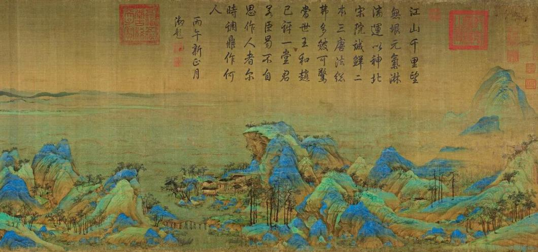 山水画卷《千里江山图》是北宋王希孟创作的绢本设色画。整体布局结构采用庐山和鄱阳湖,二者相互映衬——山包围了水,水聚拢着山。总画面呈现出一种人与自然和谐共生的美好氛围。