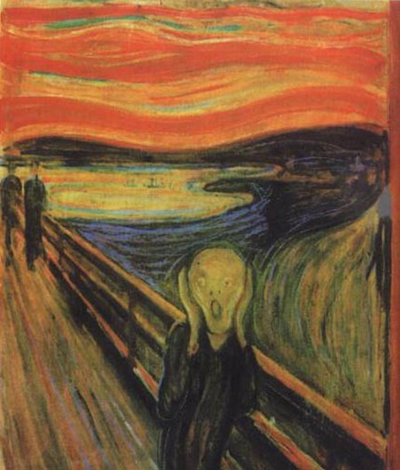 “我跟两个朋友一起迎着落日散步,我感受到一阵忧郁。突然间,天空变得血红。我停下脚步,靠着栏杆,累得要死,感觉火红的天空像鲜血一样挂在上面,刺向蓝黑色的峡湾和城市。我的朋友继续前进,我则站在那里焦虑得发抖,我感觉到大自然那剧烈而又无尽的吶喊。”