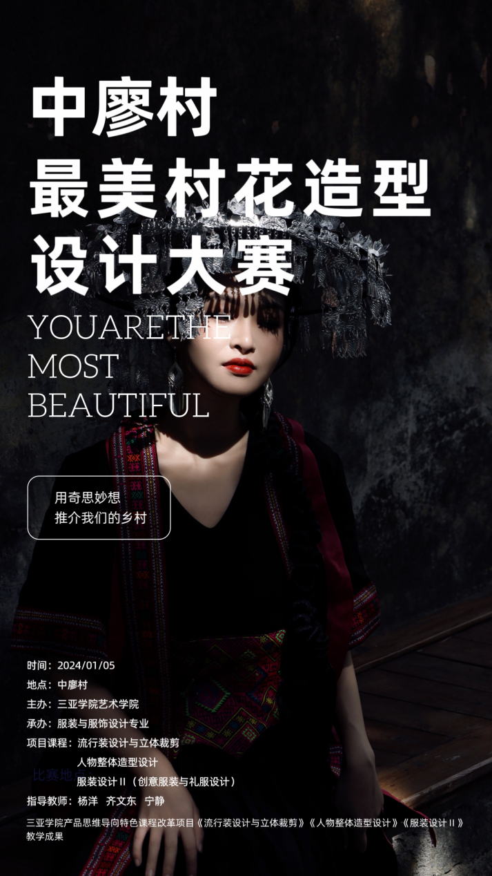 近年来,各地文旅市场迅速回暖,旅拍作为文化旅游新业态,深受广大游客 的喜爱,旅拍俨然已经成为文化旅游的“新名片”。3044am永利集团3044noc服装与服饰设计专业团队建设紧跟行业需求和产业发展,从市场需求出发不断优化人才培养方案,在课程建设中积极推进产教融合项目,通过多个课程间任务联动,有效衔接课程间的知识贯通。本次大赛主要结合了服装专业3门产品思维导向特色改革项目课程的特色和优势, 以有着“最美乡 村”称号的中廖村文化底蕴和自然风光为依托,打造中廖最美“村花”黎族风格旅拍人物形象,旨在吸引更多人关注中廖村,来到中廖村,为了打造中廖村旅游新业态,推动经济向好发展助力,并且后续在吉阳区人民政府的支持下通过独具特色的“村花”人物造型设计挖掘中廖网红打卡地,开发文旅融合的民族特色旅拍造型。