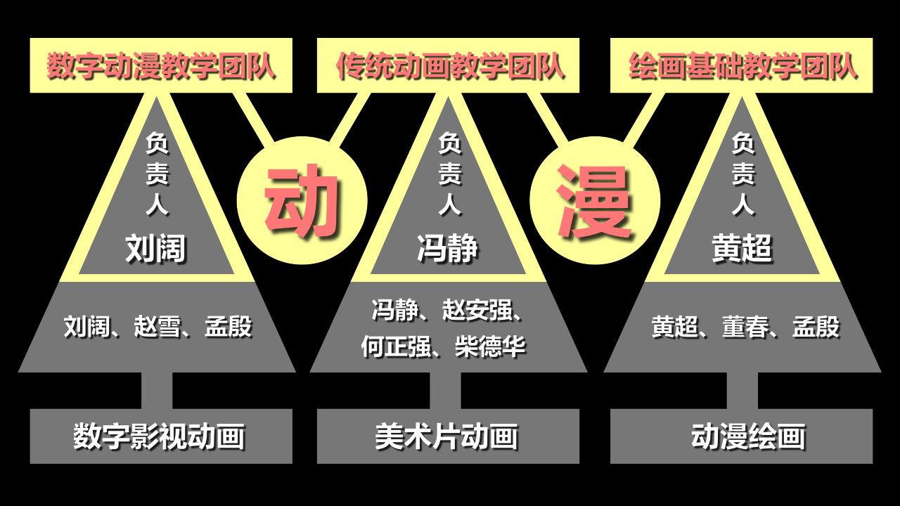 本年度,动画专业组建了数字动漫、传统动画、绘画基础三个教学与科研团队。其中,数字动漫教学团队的业务定位为数字影视动画、传统动画教学团队的业务定位为美术片动画、绘画基础教学团队的业务定位为动漫绘画。三个团队即可独立运行也可合作研究,数字动漫教学团队与传统动画教学团队可对标动态视频领域、传统动画教学团队与绘画基础教学团队可对标动漫画静帧领域。