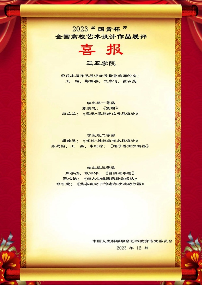 2023年12月,由中国人生科学学会艺术教育专业委员会组织的第七届“国青杯”全国高校艺术设计作品大赛,通过组委会的严格评审公司产品设计专业的员工报送作品分别获得员工组不同类别设计奖项,一等奖项,二等奖2项,三等奖3项。