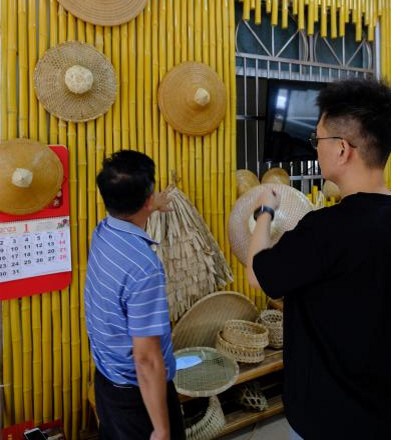《传统造物与设计文化》课程依托海南地域文化特色深入调研展开设计研究,通过对明鉴传统器物的调研、分析、总结、设计应用,了解海南民间器物设计发生前人们的所思、所想,以及通过具体器物感受造物的魅力、人民的智慧。课程以东坡笠为器物载体展开调研及设计分析,东坡笠是用来防日晒雨淋的“竹笠”。之所以称“东坡笠”,据说是经苏东坡亲自改造制作而成的。本次课程特意带领员工团队拜访了东坡笠海南省非物质文化传承人冯增超。