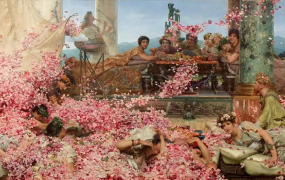 现在我们所看到的是全世界最有名的一片花海,这片花海中每一片花瓣都透露着对穷奢极欲的无限崇拜,这就是画家阿尔玛·塔德玛笔下的《荷里奥盖巴留的玫瑰》。这幅画描绘了帝王荷里奥盖巴留举办的一场宴会,据《罗马帝王纪》描述,荷里奥盖巴留设计了一个可翻转的天花板,只是当时宴会上洒落的不是玫瑰而是紫罗兰和其他鲜花。宾客便如画中描绘的一般被掩埋于花海,有人无法爬出最终窒息而亡。玫瑰在古代是帝王尊贵的象征。而在19世纪的花语中,玫瑰一般代表美和感性的爱,后来在文艺中还染上了“颓废”的意味。当时的文艺大多把基督徒划为“好”的范畴,而将罗马皇帝与之相对划入“坏”的范畴。塔德玛的作品同样也在他死后被鄙视为了堕落颓废的艺术,被扫入了历史的垃圾堆。