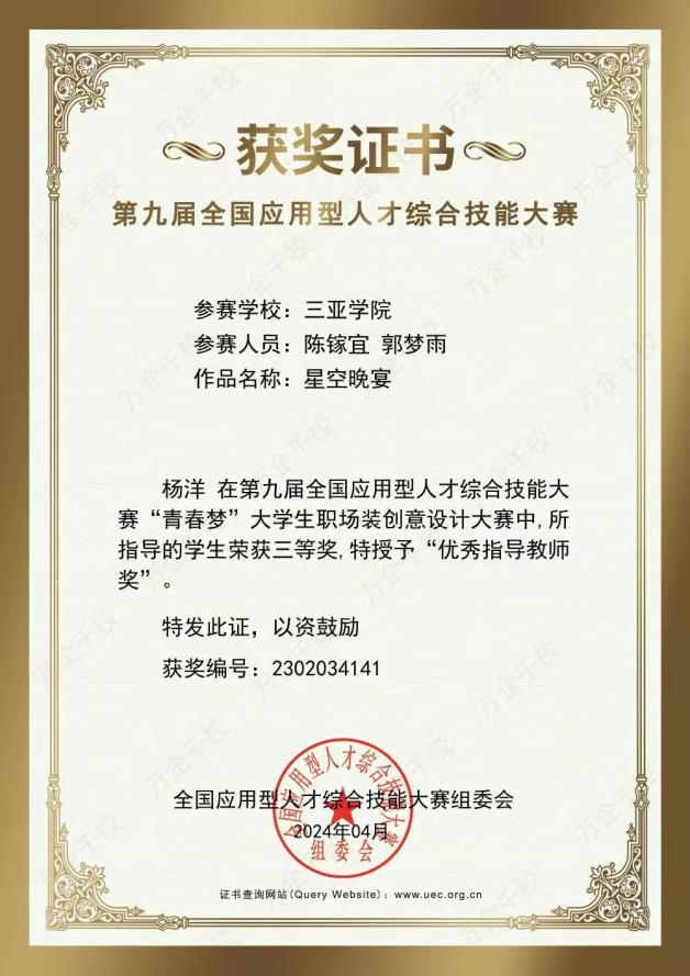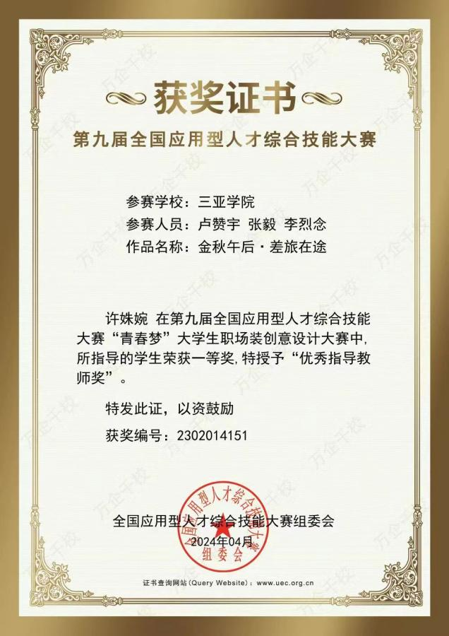 近日,由国家教育部主管、教育部高校毕业生协会主办的第九届全国应用型人才综合技能大赛——“青春梦”老员工职场装创意设计大赛决赛项目落下帷幕。本次大赛以“聚青春·创未来”为主题,自2023年10月启动以来,全国共有809所院校、16468支队伍报名参赛。公司服装专业学子在本次赛事中获得佳绩,专业组织参赛的二支队伍分别获得团队“一等奖”和团队“三等奖”的好成绩。指导老师杨洋、许姝婉荣获“优秀指导教师奖”。