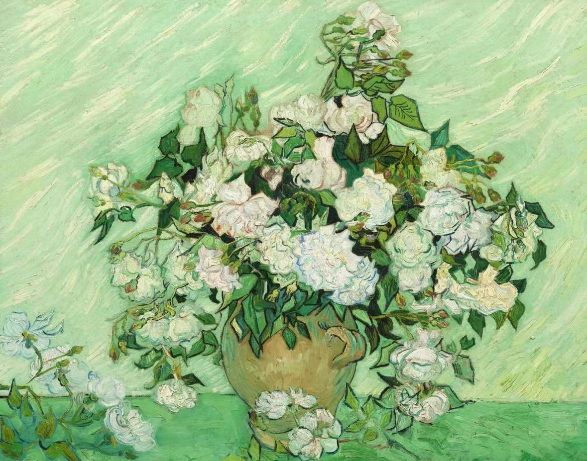 在清新的绿色背景的衬托下,玫瑰从棕褐色的水壶脖子上迸发出来,几乎填满了画面的高度,散发着强烈的生命力,这便是梵高在1890年创作的《白玫瑰》。舒展的一株株白玫瑰有着大而圆的花瓣,带有牛仔蓝、蓝绿、紫红、青绿和黄油黄的色彩。翠绿色的叶子填满了花瓣之间的空隙。罐子有一个短而圆的手柄,放在一个海蓝色的表面上。一些花朵散落在画面的左下角和罐子的底部。许多花、叶子和罐子都用深蓝色或黑色勾勒出轮廓。背景是薄荷绿色的墙壁,上面有波浪状的米白色条纹。