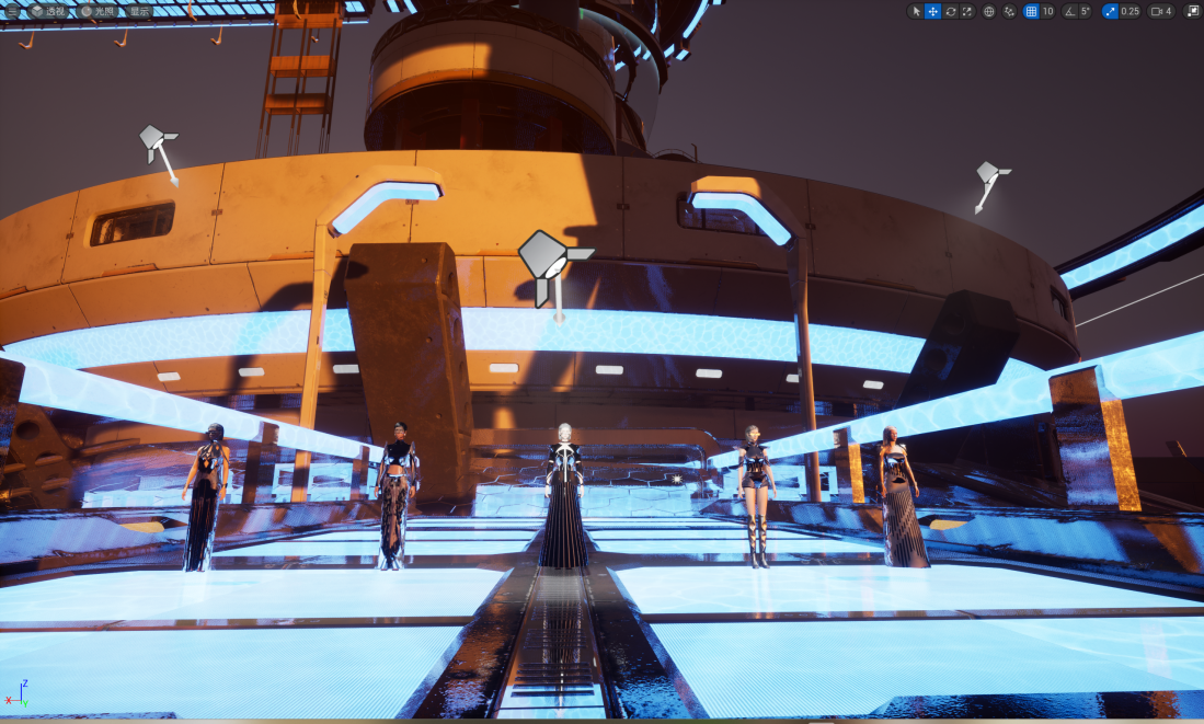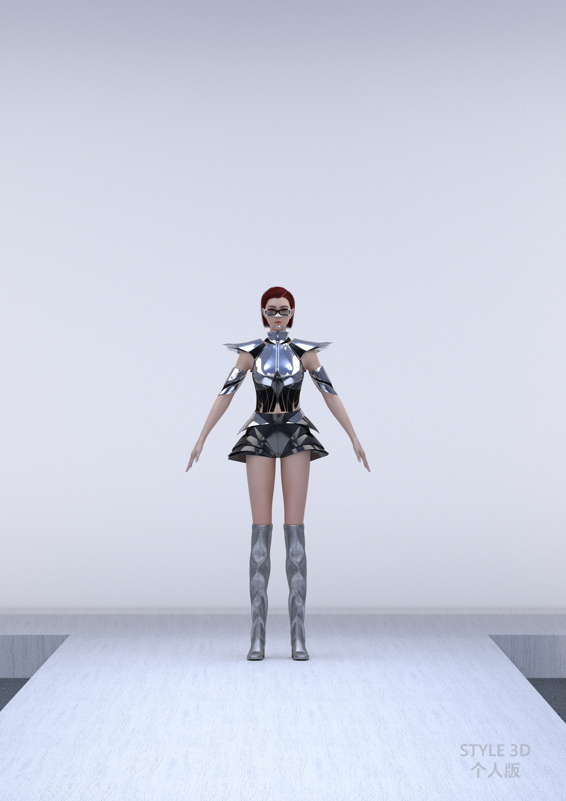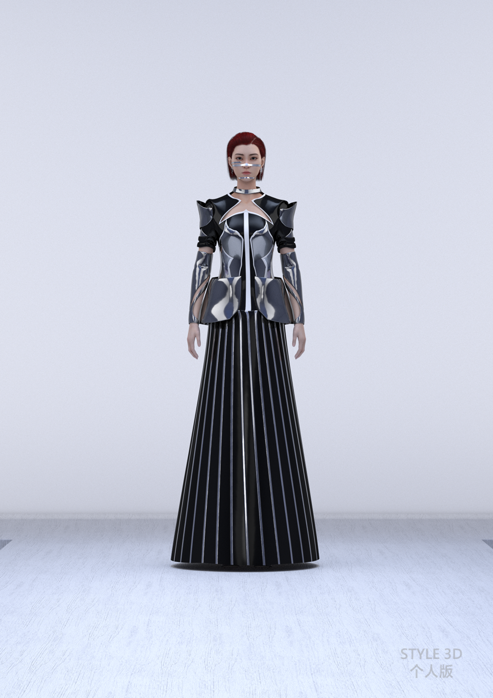 服装轮廓形以具有科技感的夸张款式为主,在整体结构和廓形上。对结构板片进行分割,分层塑性叠加,通过空间层次的对比、局部夸张的廊形。来体现未来科技感,突出的肩部线条以及面料质感的对比。