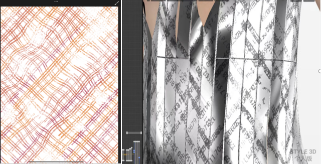 灵感提取设计:以代码灵感提取设计,以代码字母为灵感进行再造,将代码以具象化的方式呈现出来。代码字母的交错排列结合未来主义风格的组合将时间具象化,视觉化,并运用在面料设计中。