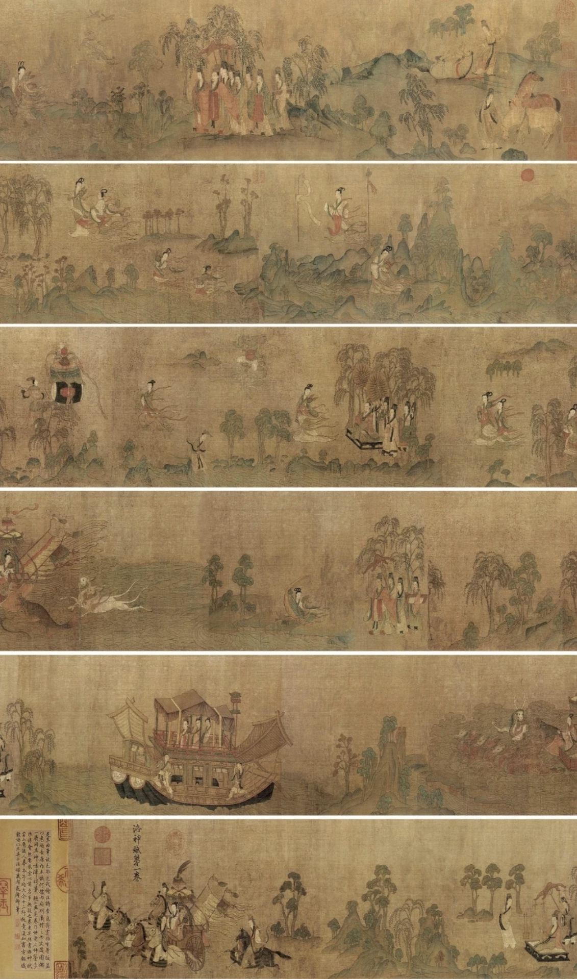 《洛神赋图》是东晋时期著名画家顾恺之根据曹植的《洛神赋》创作的绢本设色画卷。《洛神赋》中的诗句生动地描绘了洛神的美丽形象,展示了曹植的深厚文学功底和对美的极致追求。