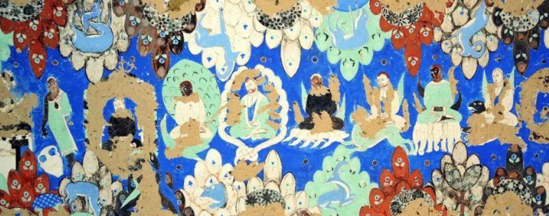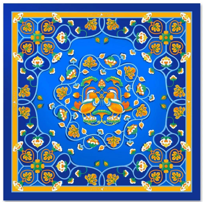 同样是端木良锦的设计——方巾(图4)。她的灵感来自于日本正仓院藏的唐代“赤地鸳鸯唐草纹锦大幡垂饰”中的鸳鸯唐草纹(图5)。而色彩则是来自于敦煌壁画中鲜艳斑斓的蓝底辩经图(图6)。设计师把“赤地鸳鸯唐草纹锦大幡垂饰”中的鸳鸯唐草纹和敦煌蓝底辩经图的色彩相结合,进行在创作,成果设计出了色艳鲜亮,纹饰优雅的方巾。