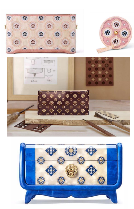 此外,我们还采用了由中国80后设计师创立的中国当代设计品牌——椴木良锦——的设计作品,化妆镜设计和坤包设计(图3)。我们可以看到,设计师的设计灵感正是原自于唐代的木胎漆器琵琶装饰纹样——螺钿团花纹,虽然分别在色彩上、工艺上或造型上有所变化(色彩除了褐色,还增加了粉色和蓝色。工艺上,对团花图案的处理,由螺钿镶嵌变成了细木镶嵌。造型上增加了鸟纹,或是在团花的造型上做出了细节的调整。)但其设计灵感源头还是清晰可见的。设计师在传统图案的基础上进行了再创作,更加突出了中国传统艺术中的柔美、优雅和精致,把古老的和现代的,传统性和时尚性相结合,这是对传统设计文化的再发展和再创造的优秀案例。