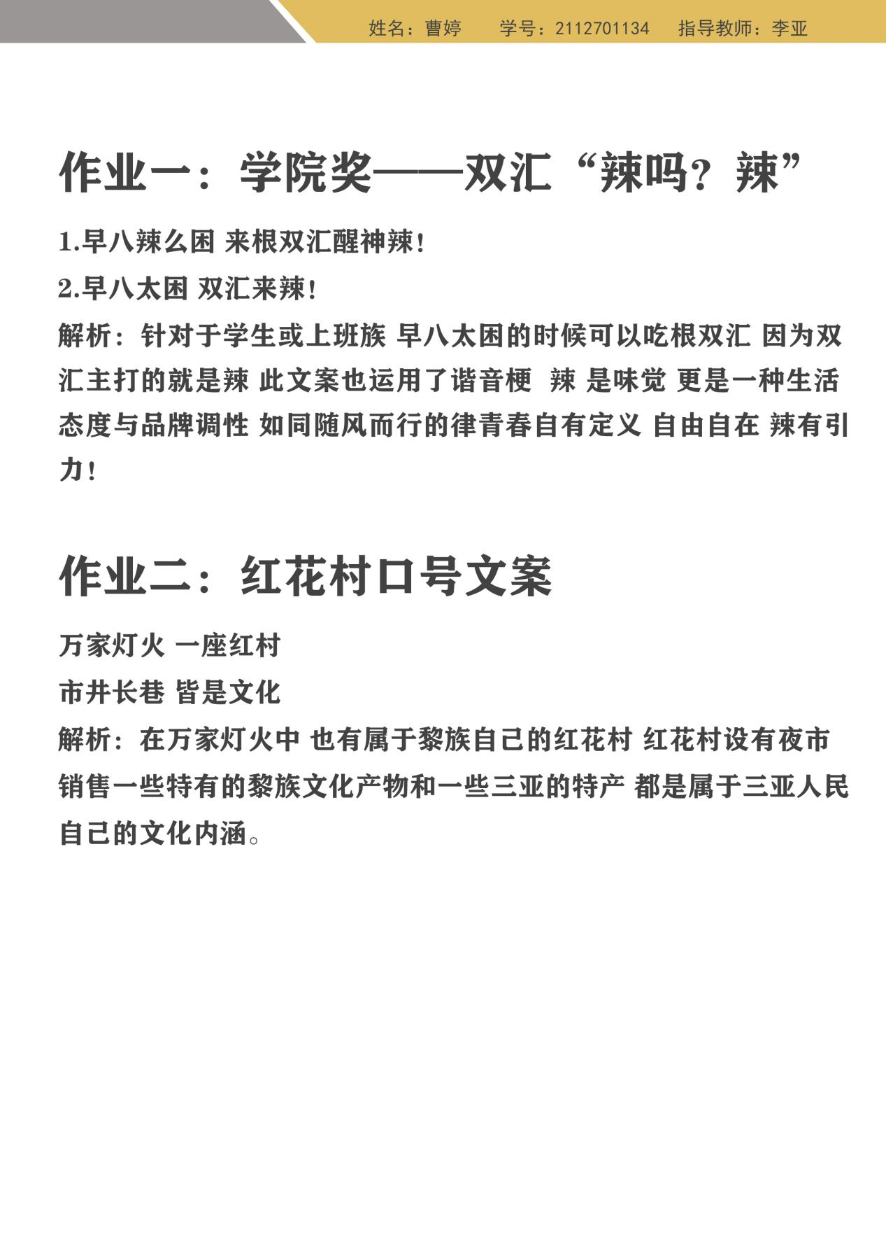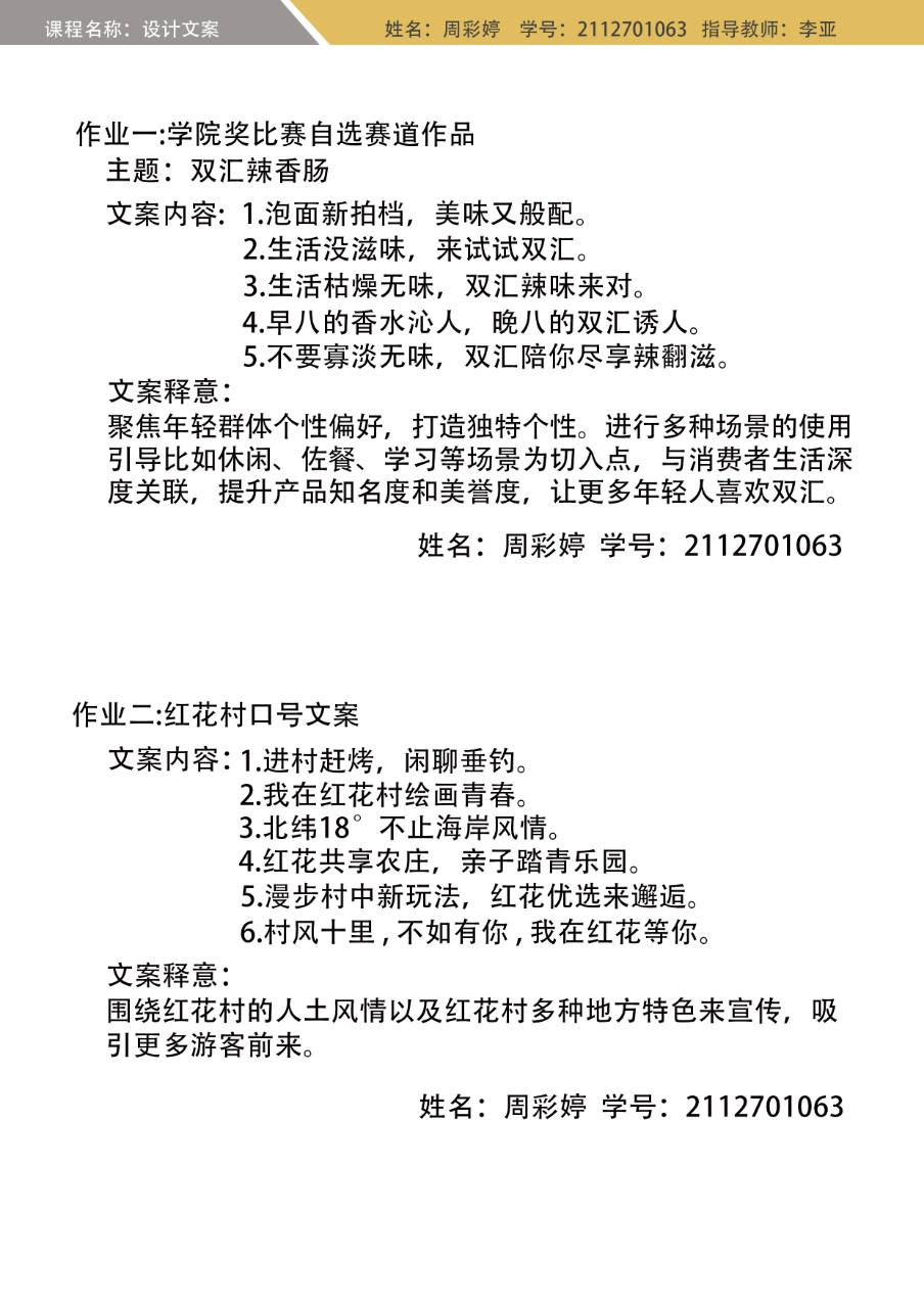 设计文案课程充分利用互联网优势资源及现代化教学手段,打破旧有教学模式中只注重理论掌握而忽略实际案例的创作实践。课堂中引入多种文案文字打磨技巧练习方式、语言修辞使用技巧练习、仿写练习等等,通过练习由浅入深的在情景中带入设计文案练习,提升教学效率,增强创作能力。以下分享文案课中部分练习创作作品: