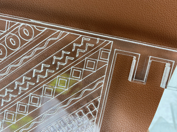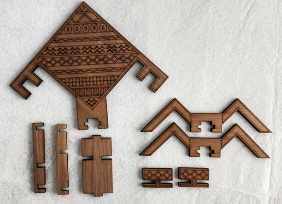 在打装饰纹样的时候出现木头极易烧焦并出现木材顺着木纹断裂。最后的解决办法是调整激光切割机在切割的时候输出的参数。白木的纹样装饰也有十分强烈的视觉效果。