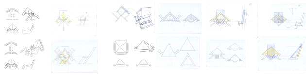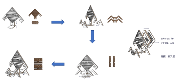 在设计的过程中尽量利用纹样本身的结构满足要求形态和功能的需求,因此,选择的是比较整体的纹样,黎锦蛙纹纹样的整体是菱格形的结构,尝试了各种放置的方式以及连接的方式,最终采用的是榫卯的卡口结构,利用榫卯的结构满足形体的穿插和链接,实现纹样的立体化目标(图4)。