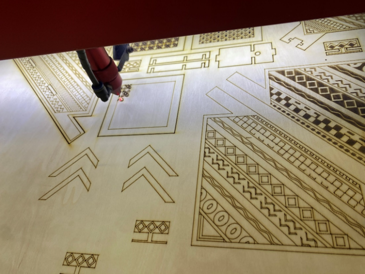 先试验的第一种材质是木材,首先是椴木,由于激光切割机的工作原理,木材切割后切口有烧焦的痕迹,经过试验,用椴木层板打出来的纹样装饰有较强烈的视觉效果。
