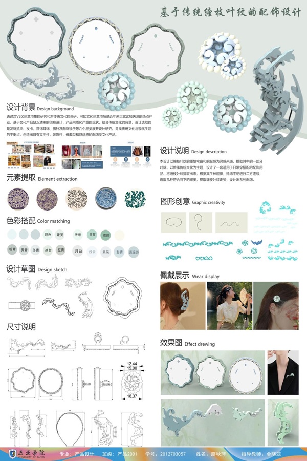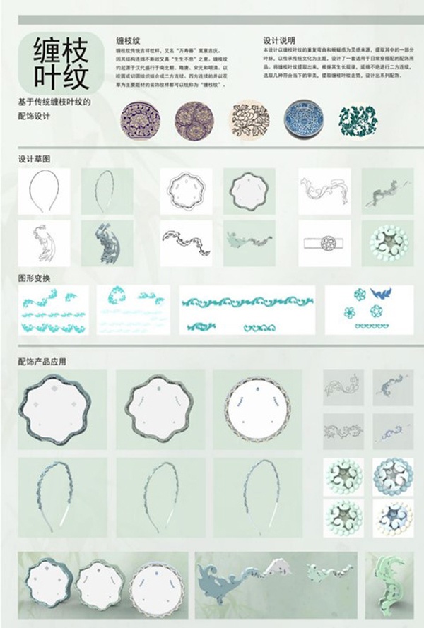 产品设计专业员工廖秋萍主要负责“V5区”项目原创文化产品设计及研发工作。参与以“宋时明月”为主题的配饰类文化产品设计项目,并将此次实践项目作为20级毕业设计项目跟进。以传统缠枝叶纹为元素,以女性配饰类用品为载体,从造型和装饰两个方面进行现代化创新设计。