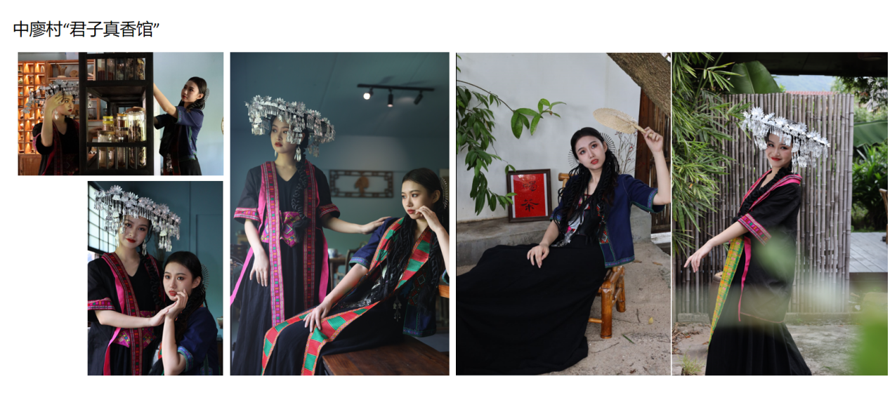 第二组“中廖村花”团队前往中廖村拍摄,当天共完成2套“村花”造型设计。拍摄场景为“中廖村上书屋”“中廖石桥”“南非叶茶坊”。