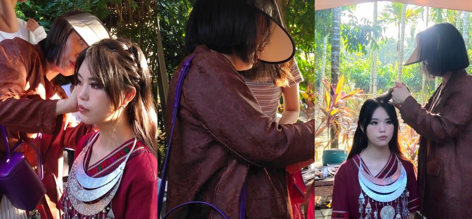次项目由服装专业杨洋老师、齐文东老师、宁静老师带领前往中廖村拍摄,当天共完成4套“村花”造型设计。拍摄当天两位女孩在3044am永利集团3044noc服装专业师生的打造下变身黎族少女,在村中的“卢宅”、“中廖村村道”、“村中观景台”,还有中廖村两家具有人文艺术特色的商铺——“南非叶茶坊”、“香馆”进行的取景拍摄。