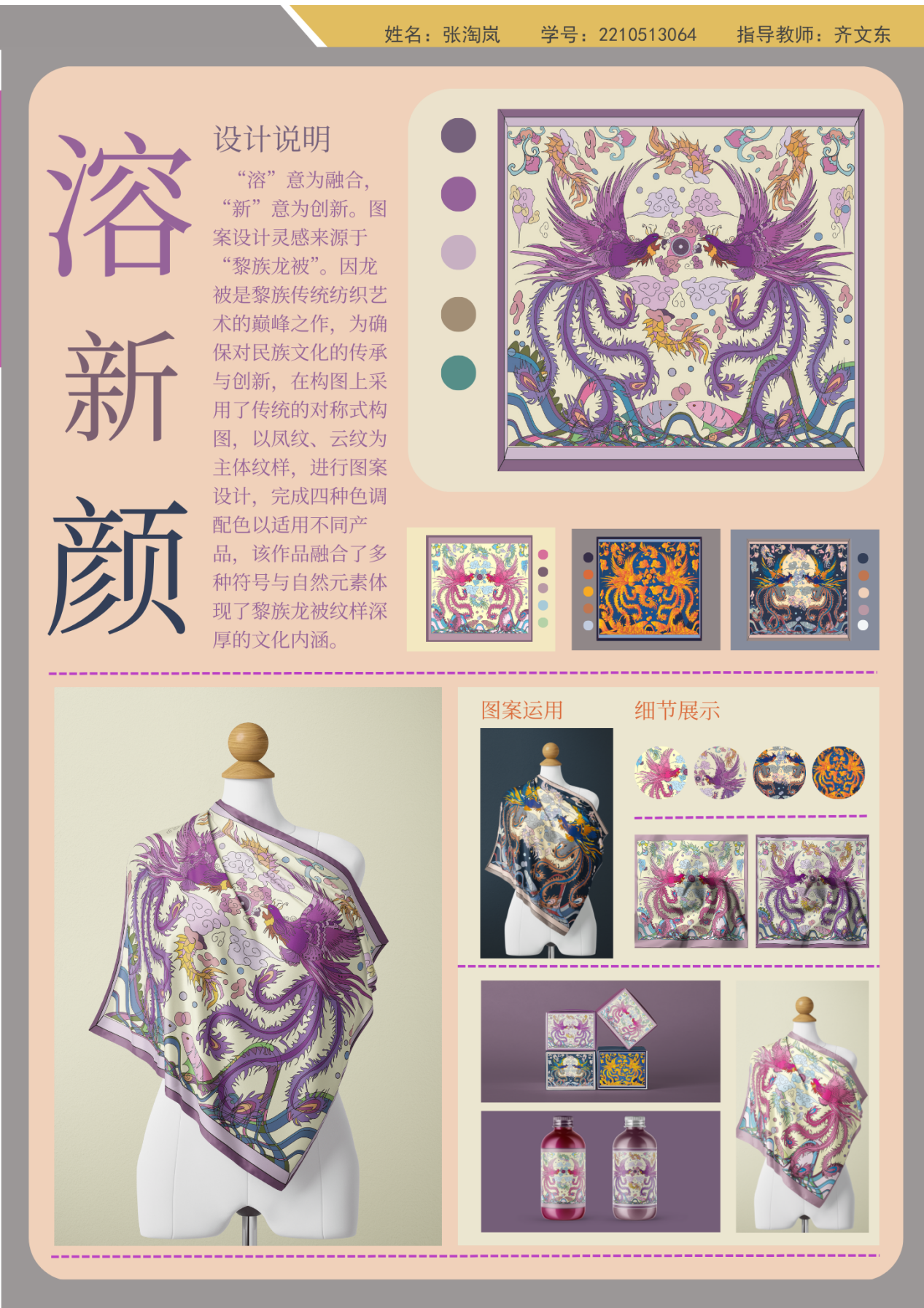 课程简介:《服饰图案与色彩设计》是一门集艺术性、实用性和技术性于一体的综合课程,它不仅涉及美学原则,还包含了丰富的文化内涵。本门课程从认识服饰图案的造型语言、构成方法和配色规律,到掌握图案在服装上的设计表现技法。主要培养形象思维的创造力和对形式美的审美能力。通过一系列的学习能够掌握传统图案在现代服装中的应用特点及文化内涵,并能在理解流行趋势的前提下,认识不同类别的服装中图案的设计应用。服装图案不仅仅是装饰,它还能增强服装的艺术性和时尚性,通过课程任务的布置将图案设计应用于实例中,扩展思维,提升服装设计创新能力。