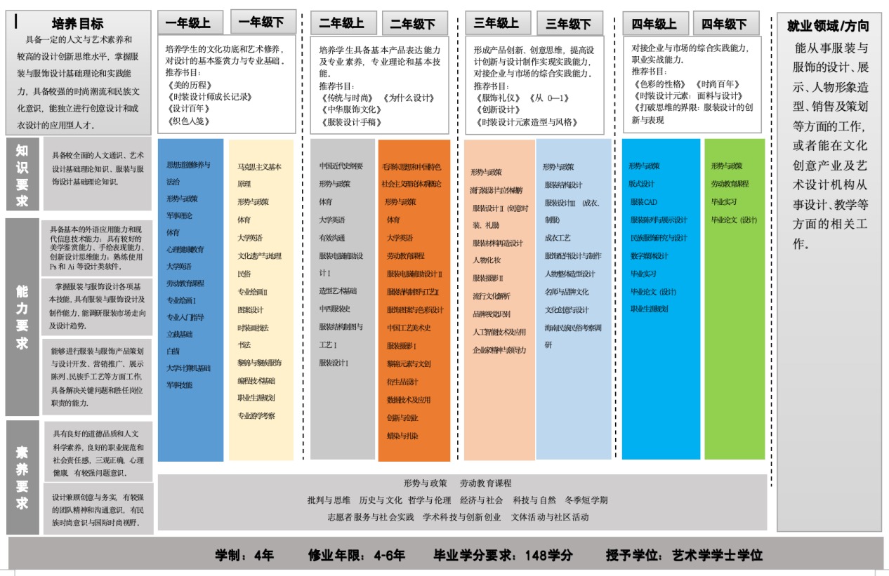 具备科学与人文通识,掌握艺术设计、服装与服饰设计学科基本理论与知识,掌握服装与服饰设计的基本原理和方法;熟悉服装与服饰设计行业相关各环节的实务知识;具备文献检索、资料查询的基本能力;对相关自然科学、工程技术的基本知识有所了解。