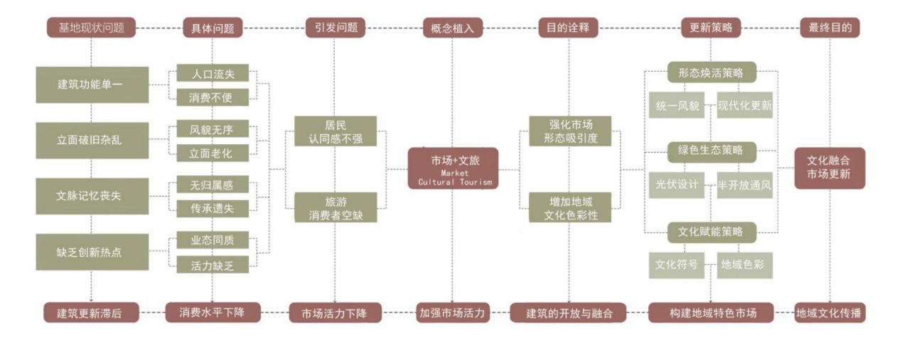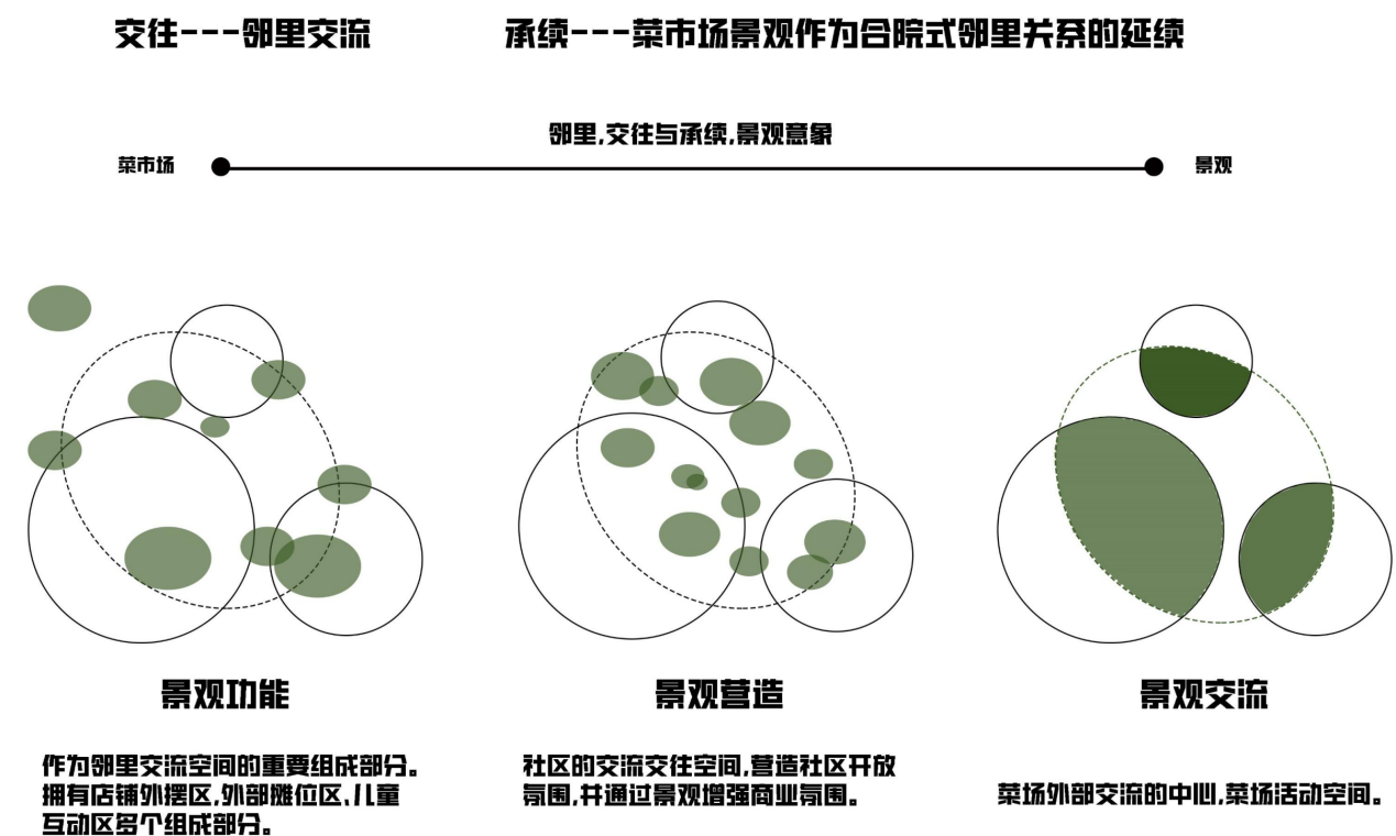 在服务公众需求的前提下,建立与城市紧密连接城市可识别性高、流线清晰、开放时间较长,采用自然采光和通风的社区 相邻市场。 通过特定设计的空间环境触发频繁交流、相遇机会,增加邻里交往的公共空间,解决现存问题,考虑消费者需求,具备开 放性原则,使市场内部通道整体贯穿,在功能区域中共享渗透,室内外不做完全封闭空间,保持开放状态,吸引周围人群融入 集体,更多的考虑人与人、人与群体的信息交流共享
