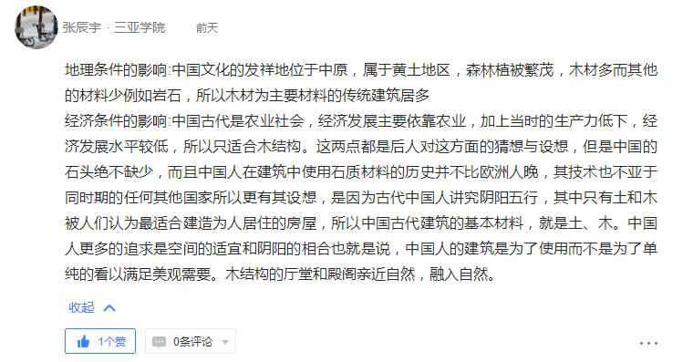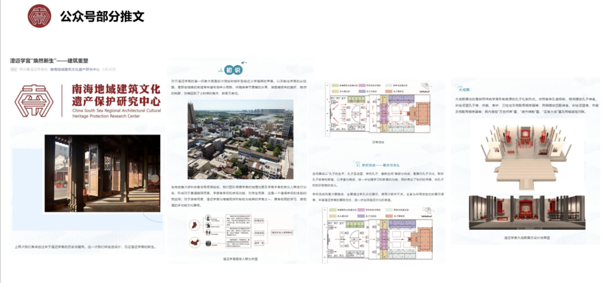 在教学中恰当融入思政教育,员工普遍反映加深了对建筑历史专业理论和实践的理解,同时树立了文化自信。课程教学始终坚持以海南本土文化遗产的价值发掘为核心,结合切实需求,为遗产地社会文化建设服务。如结合暑期调研完成了《三亚不可移动文物普查》、《洋浦经济开发区不可移动文物的普查》《石石矍村冯氏祠堂的保护规划》、《发祥坊修缮设计》、《澄迈学宫的小型博物馆展陈设计》、《南山非遗博物馆展陈设计》等项目,同时以南海地域建筑文化遗产保护研究中心公众号为着力点,投入海南自由贸易区(港)建设,在引领或带动产业发展,提高国内或省内影响力和知名度、参与省委省政府脱贫攻坚、乡村振兴,年度每周发表以原创文章为主,一共发表文章155篇,原创共35篇,总用户量1284人,总阅读量2.1万次,累计分享1964次。结合三亚不可移动文物普查,打造《时光慢读系列》——探寻三亚的本土建筑与文化,内容涵盖古迹故事、崖州八景,以文章及音频的模式同步出现,以生动有趣的方式,介绍海南本土的建筑与文化,以教学促进科研,发现文物建筑的价值,形成科研成果,服务于文化遗产事业,并以科研成果反哺课堂,形成教学科研促进共生的良性循环。