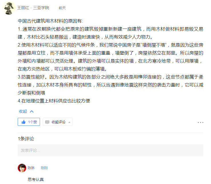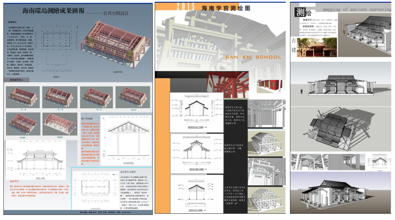 在教学中恰当融入思政教育,员工普遍反映加深了对建筑历史专业理论和实践的理解,同时树立了文化自信。课程教学始终坚持以海南本土文化遗产的价值发掘为核心,结合切实需求,为遗产地社会文化建设服务。如结合暑期调研完成了《三亚不可移动文物普查》、《洋浦经济开发区不可移动文物的普查》《石石矍村冯氏祠堂的保护规划》、《发祥坊修缮设计》、《澄迈学宫的小型博物馆展陈设计》、《南山非遗博物馆展陈设计》等项目,同时以南海地域建筑文化遗产保护研究中心公众号为着力点,投入海南自由贸易区(港)建设,在引领或带动产业发展,提高国内或省内影响力和知名度、参与省委省政府脱贫攻坚、乡村振兴,年度每周发表以原创文章为主,一共发表文章155篇,原创共35篇,总用户量1284人,总阅读量2.1万次,累计分享1964次。结合三亚不可移动文物普查,打造《时光慢读系列》——探寻三亚的本土建筑与文化,内容涵盖古迹故事、崖州八景,以文章及音频的模式同步出现,以生动有趣的方式,介绍海南本土的建筑与文化,以教学促进科研,发现文物建筑的价值,形成科研成果,服务于文化遗产事业,并以科研成果反哺课堂,形成教学科研促进共生的良性循环。