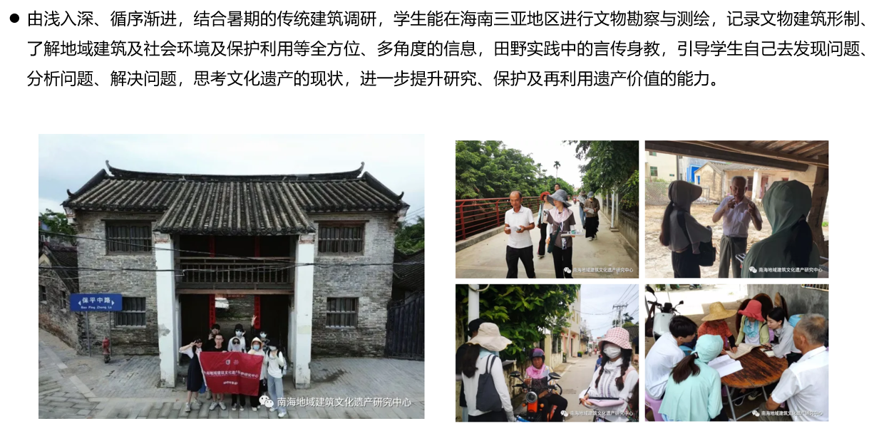 广泛采用实例教学和实践教学的方法,由浅入深、循序渐进,结合暑期的传统建筑调研,员工能在海南三亚地区进行文物勘察与测绘,记录文物建筑形制、了解地域建筑及社会环境及保护利用等全方位、多角度的信息,这种了解不是由教师通过课堂告知员工。而是通过直接的观察带来最生动的体验,而这种体验又成为设计进一步发展的认知基础。观察催生体验从而推进操作,体验则帮助抽象和重新组织。正是得益于这些有价值的认知,让创造具有丰富性和逻辑性的空间成为可能。从而达到眼、手、脑的统一性。田野实践中的言传身教,引导员工自己去发现问题、分析问题、解决问题,思考文化遗产的现状,进一步提升研究、保护及再利用遗产价值的能力。如2022年暑期环境设计的传统建筑测绘围绕三亚不可移动文物的调研展开,员工分组对崖州区、吉阳区、海棠区、天涯区进行调研,尤其是崖州区,分为不同小组,教师想方设法去引导、启发他们往更深的层次思考,间或让他们有发现的快感,以正向反馈来激发他们继续钻研的兴趣。同一个课题研究中,需要不同领域教师之间的合作,员工团队之间的合作,还有师生之间的合作擦出的火花。为了一个共同的课题目标,小组的每个成员都需要积极工作,努力完成自己承担的任务,否则就将影响总体任务的完成。小组成员还需定期进行交流、讨论。通过这些过程来锻炼员工的沟通能力和团体协作能力从而协作完成各阶段任务。鼓励教师间、师生间、同学间的讨论与交流,培养师生良好的科学态度和科学精神,以及对祖国优秀的文化遗产的责任心和使命感。