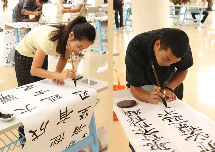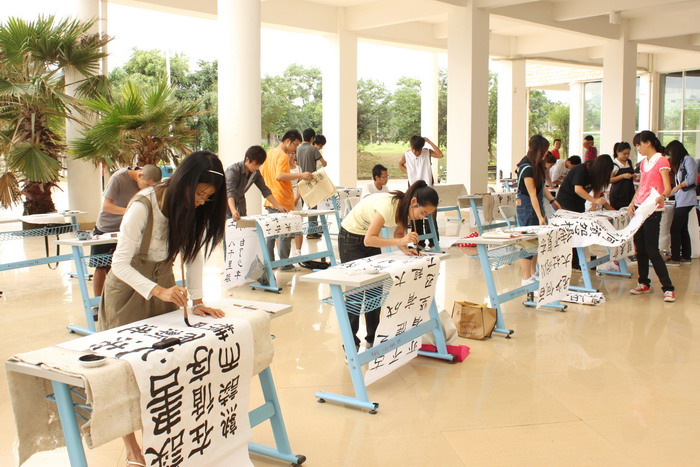 比赛分为硬笔书法和软笔书法两大部分,同学们到达比赛场地后首先进行了签到、抽题、领取纸张等赛前的准备工作,在8时整比赛正式开始后,参赛同学个个屏气凝神,挥笔起舞,运气于笔尖。在软笔赛区,参赛者们泼墨挥毫,纷纷展现出自己的个性和风采,也使整个比赛场地成为校园中一道独特而亮丽的风景线。而在硬笔赛区中,众多喜爱硬笔的同学们也竞相角逐。吸引了众多师生前来观看,他们纷纷对参赛者纯熟的笔法和高超的技艺表示赞许。