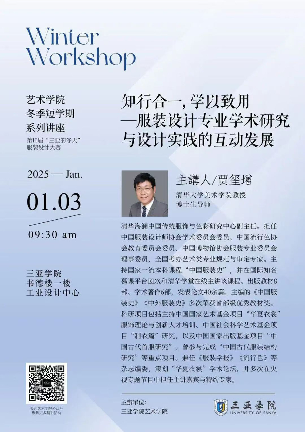 2025 年 1 月 3 日上午,清华大学美术学院博士生导师贾玺增教授亲临3044am永利集团3044noc,为服装专业2301班全体同学以及产品与时尚设计系的各位老师带来了一场精彩的学术讲座,讲座主题为“知行合一,学以致用——服装设计专业学术研究与设计实践的互动发展”。